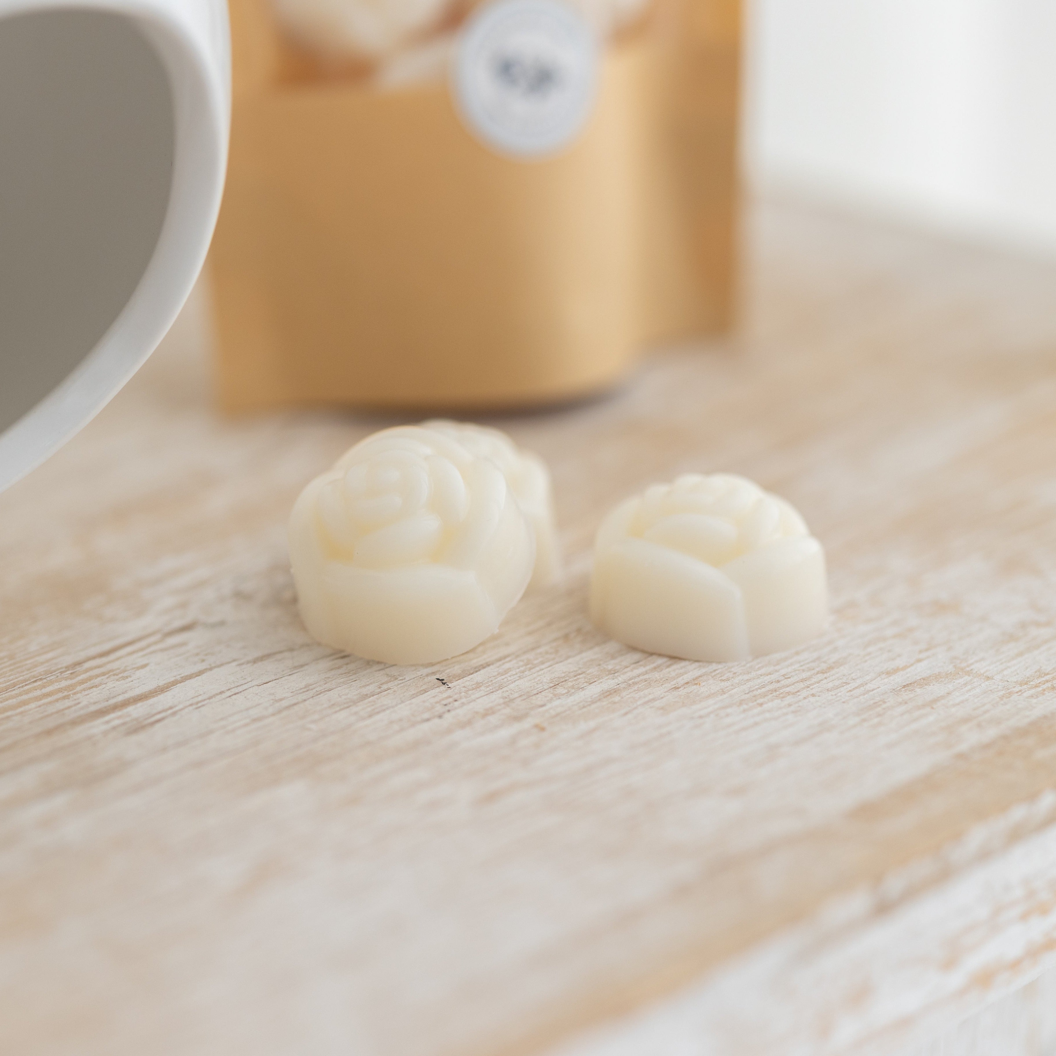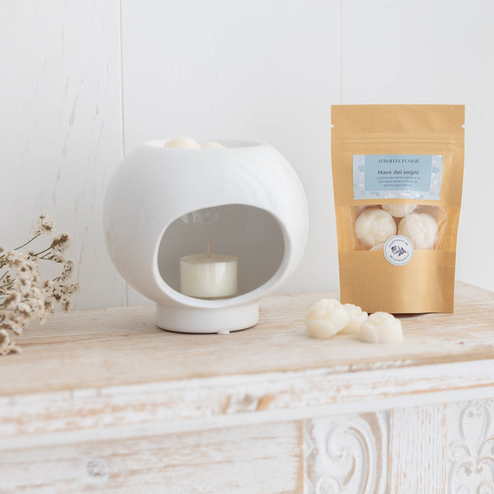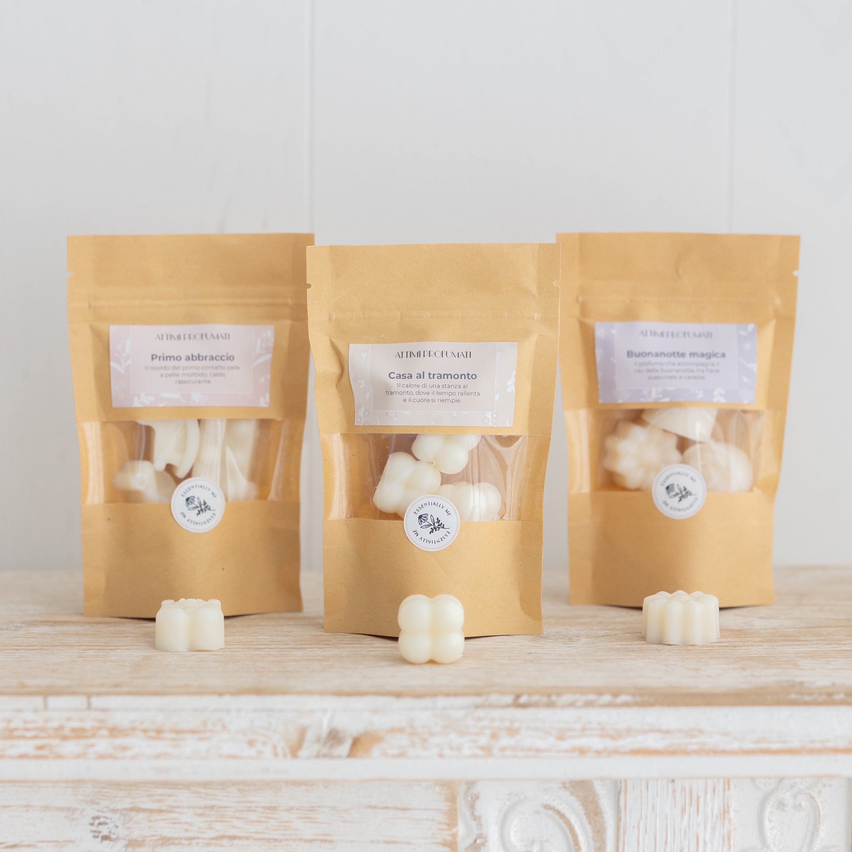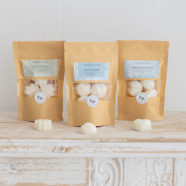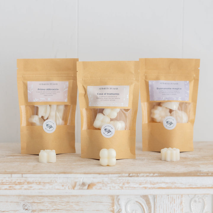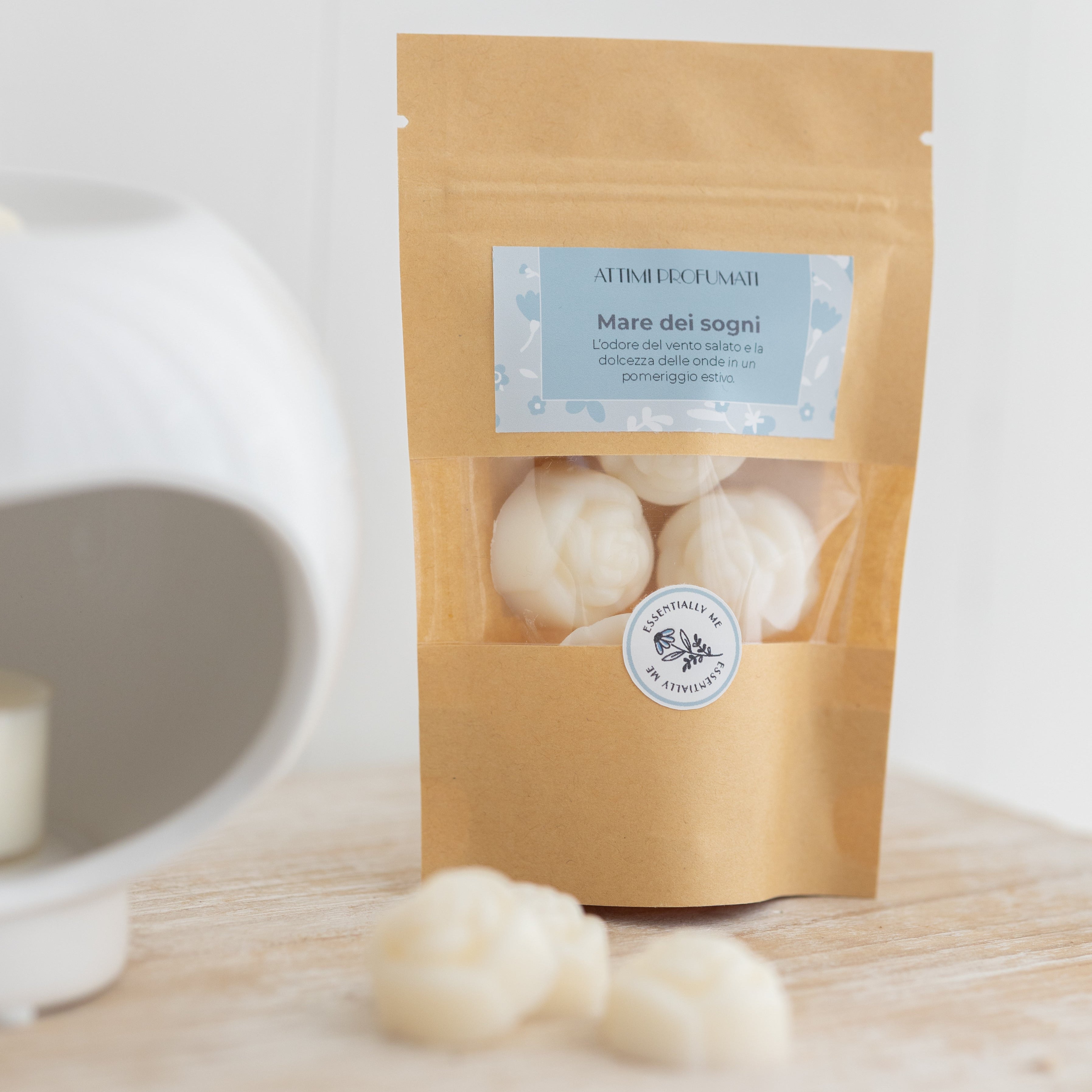 Le cialdine in cera di soia profumata si sciolgono lentamente, liberando nell’aria carezze di fragranze delicate. Un invito a rallentare, a creare attimi di pura poesia e dolce intimità nella tua casa.