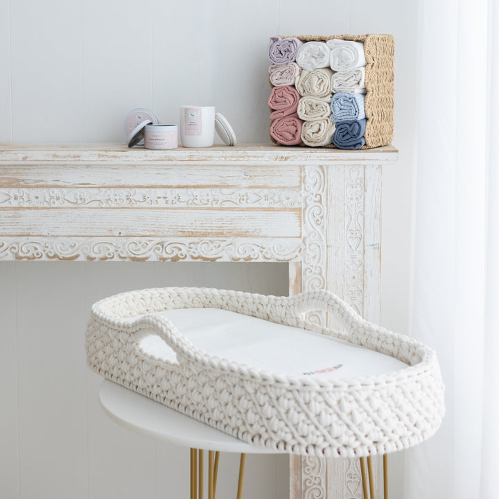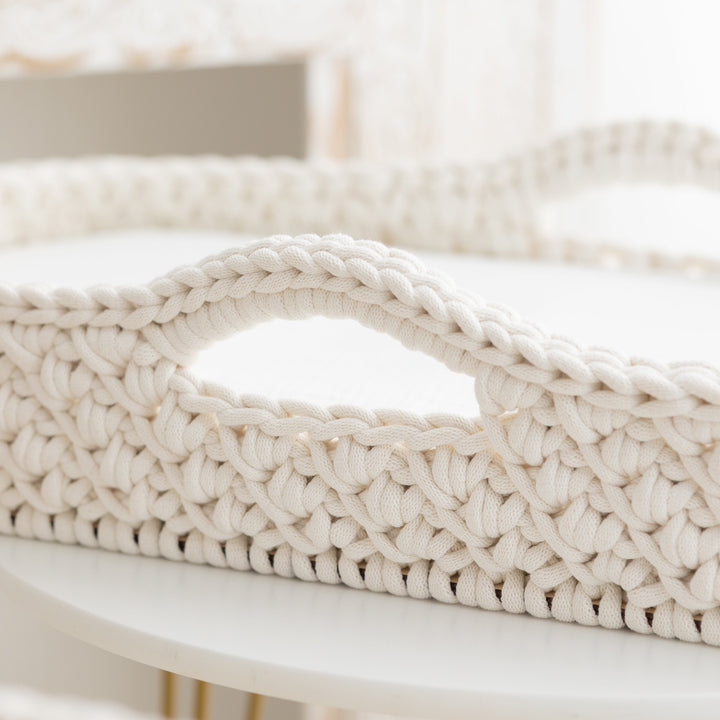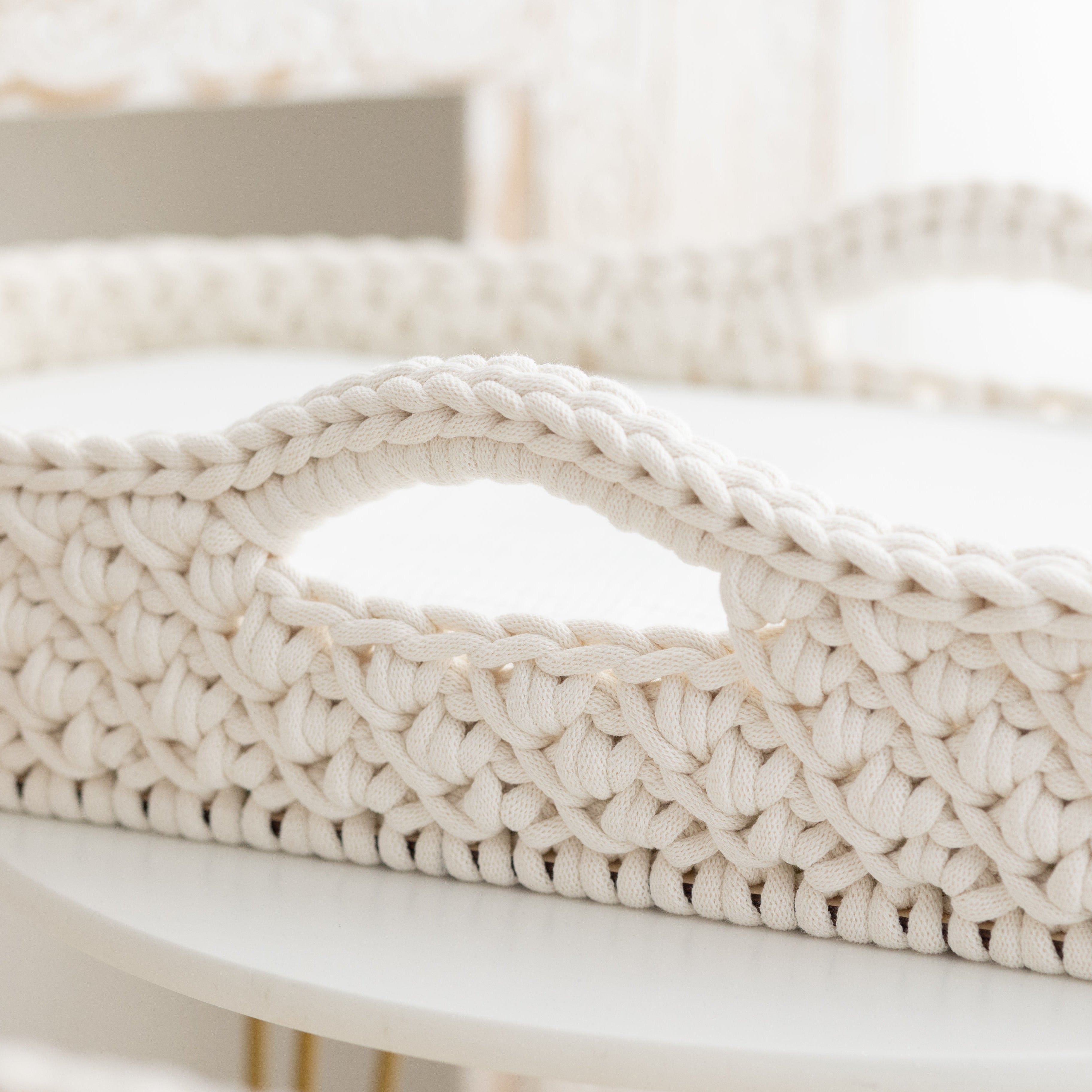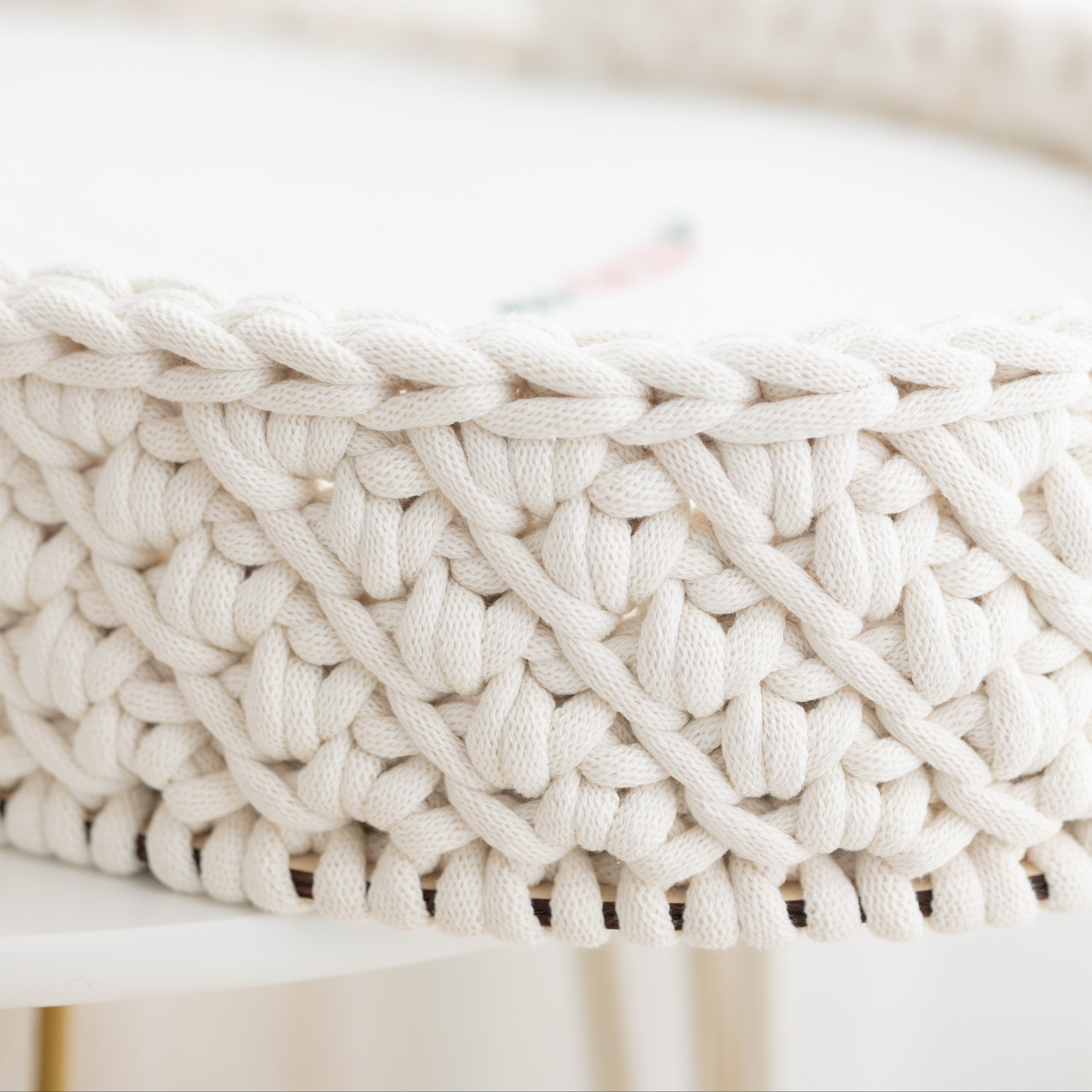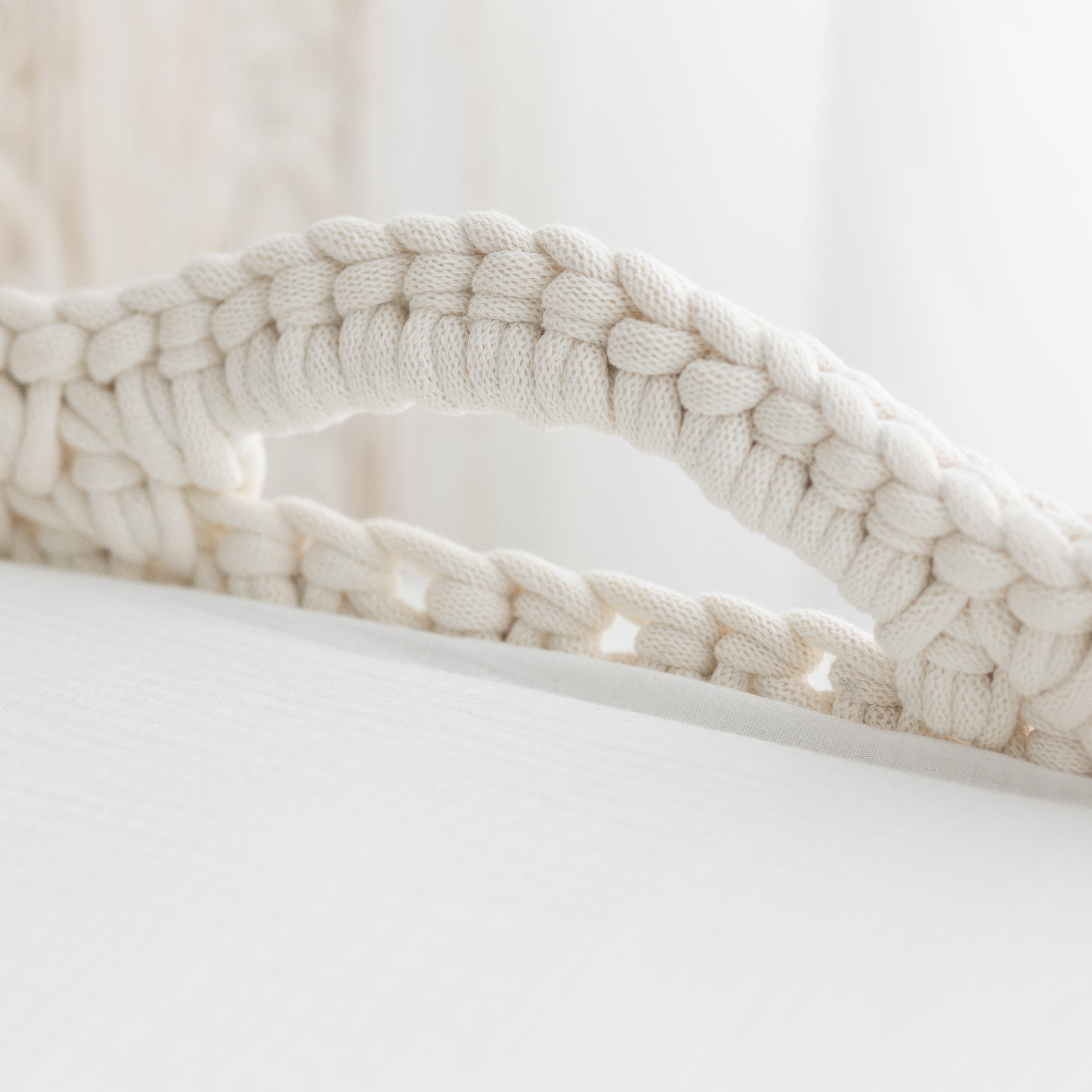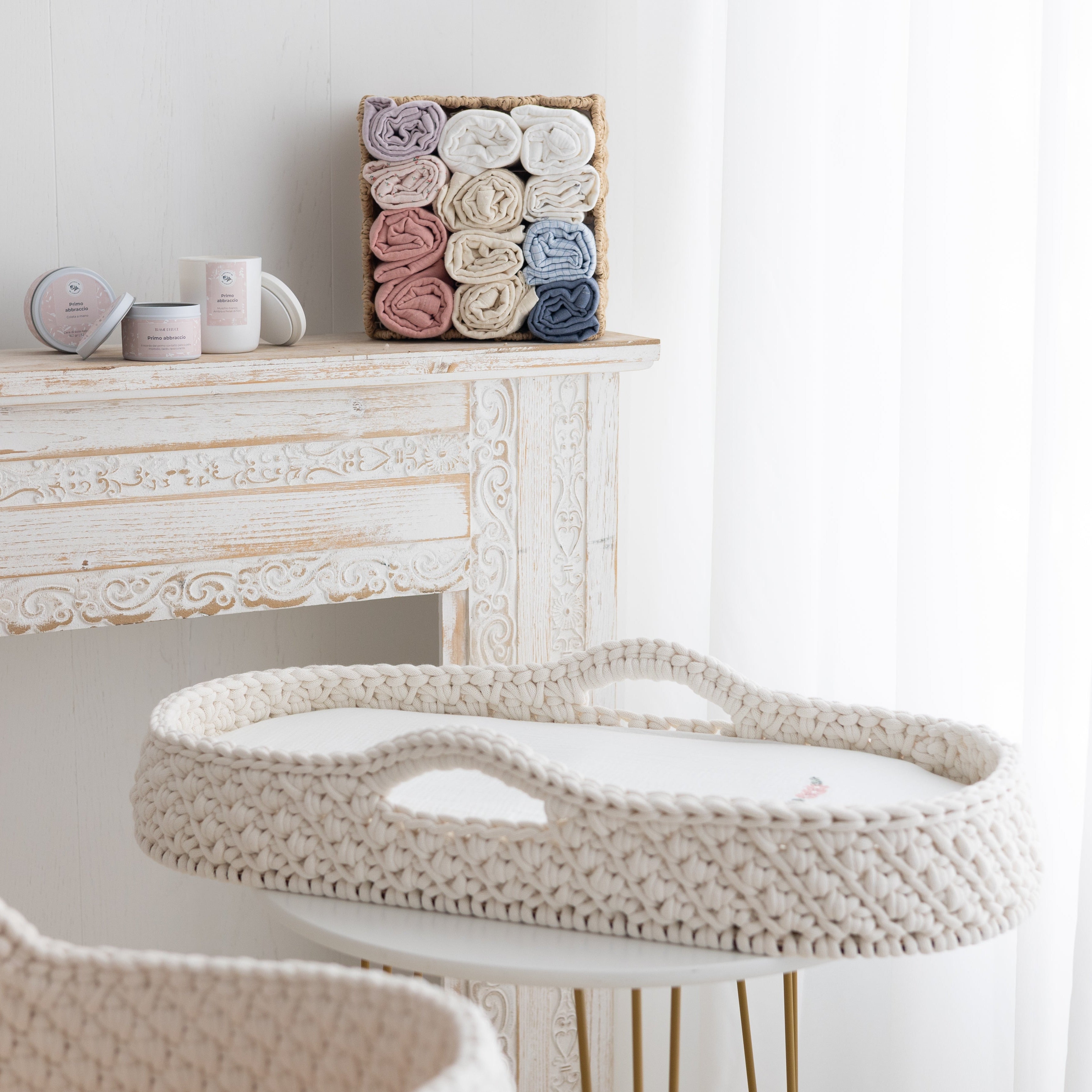 Un dolce nido intrecciato con amore, pensato per accompagnare i gesti quotidiani di cura e dolcezza. Il fasciatoio in corda di cotone lavorato all'uncinetto è realizzato interamente a mano, con filati naturali certificati OEKO-TEX e una struttura solida che unisce eleganza e sicurezza.